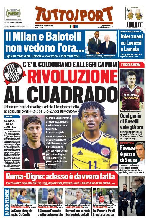“Rivoluzione al Cuadrado“, questo il titolo in prima pagina oggi, martedì 25 agosto, su Tuttosport. Il riferimento è all’acquisto dell’esterno colombiano da parte della Juventus che potrebbe quindi abbandonare l’idea del trequartista e passare al 4-3-3 o al 3-5-2. Si pensa anche a Montolivo dal Milan.