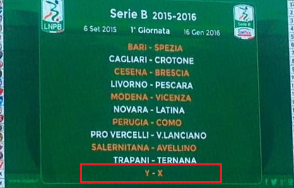 La Serie B 2015/2016 è ufficialmente iniziata. A Pescara, infatti, quest’oggi sono stati varati i calendari della prossima serie cadetta che comincerà il 6 settembre. Sorprese già alla prima giornata: subito il derby campano Salernitana-Avellino e il match tra due candidate alla promozione come Bari-Spezia. Quello che però balza clamorosamente all’occhio è che l’ultima sfida della giornata sarà giocata tra Y e X.