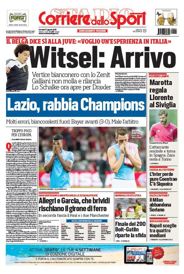 Apertura dell’edizione odierna, di giovedì 27 agosto, del Corriere dello Sport dedicata alla Lazio e all’eliminazione dal play-off di Champions League: “Lazio, rabbia Champions. Molti errori, biancocelesti fuori: Bayer avanti 3-0, male l’arbitro“. In taglio alto la Juventus con Witsel che apre ai bianconeri: “Arrivo. Voglio un’esperienza in Italia”.