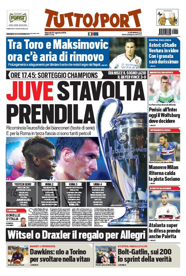 “Juve, stavolta prendila“, questo il titolo in prima pagina oggi, giovedì 27 agosto, su Tuttosport. Il riferimento è alla Champions League che vedrà i bianconeri partire dalla prima fascia al sorteggio dei gironi che avverrà oggi alle 17:45, la Roma invece sarà in terza fascia. Lazio eliminata al play -off dal Bayer Leverkusen.