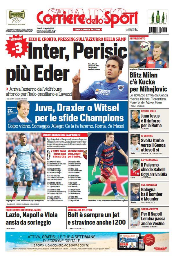 Tantissimo mercato sulla prima pagina di oggi, venerdì 28 agosto, del Corriere dello Sport: “Inter, Perisic più Eder. Affondo per l’italo-brasiliano e Lavezzi, arriva l’esterno del Wolfsburg“. Poi i sorteggi Champions di Juventus e Roma.