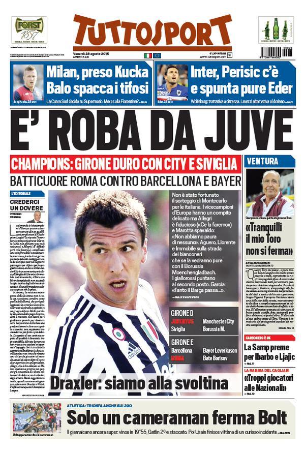 “È roba da Juve“, è questo il titolo in prima pagina oggi, venerdì 28 agosto, su Tuttosport. Il riferimento è ai sorteggi di Champions League con i bianconeri che se la vedranno con City, Siviglia e Borussia Monchengladbach, per la Roma ci sono Barcellona, Byer Leverkusen e Bate Borisov.