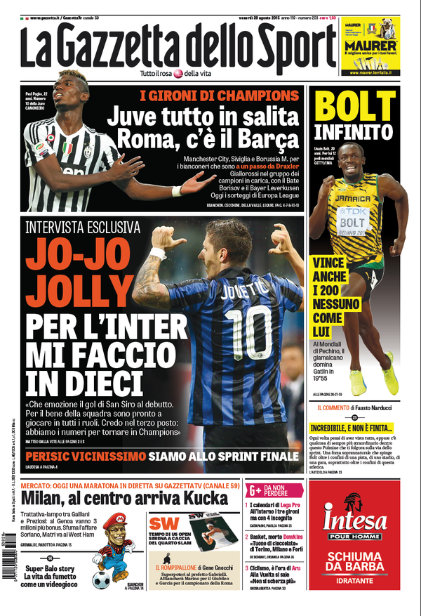 Intervista esclusiva a Jovetic in prima pagina oggi, venerdì 28 agosto, sulla Gazzetta dello Sport: “Per l’Inter mi faccio in dieci“. In taglio alto i sorteggi dei gironi di Champions League per Juventus e Roma, per i bianconeri girone durissimo mentre i giallorossi pescano il il Barça.