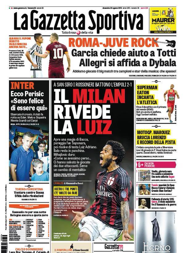 Primo piano dedicato al Milan, sulla prima pagina di oggi, domenica 30 agosto, della Gazzetta dello Sport: “Il Milan rivede la Luiz. A San Siro i rossoneri battono l’Empoli 2-1. Reti di Bacca, Saponara e Luiz Adriano“. Poi spazio al Sassuolo vittorioso per 0-1 a Bologna contro il falsinei e quindi, momentaneamente, primo in classifica: “Sassuolo re per una notte“.