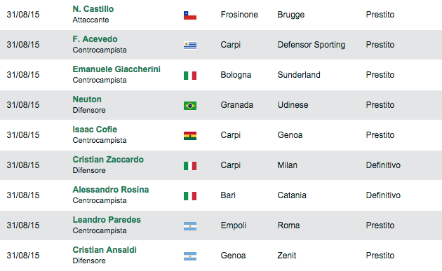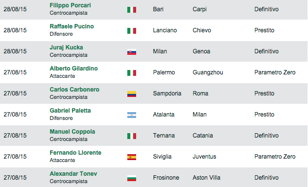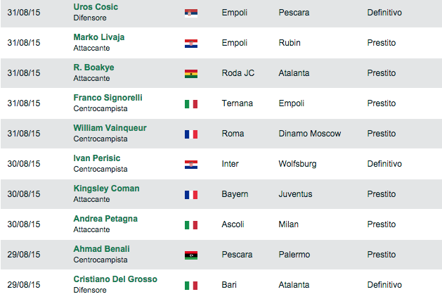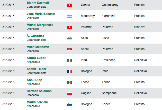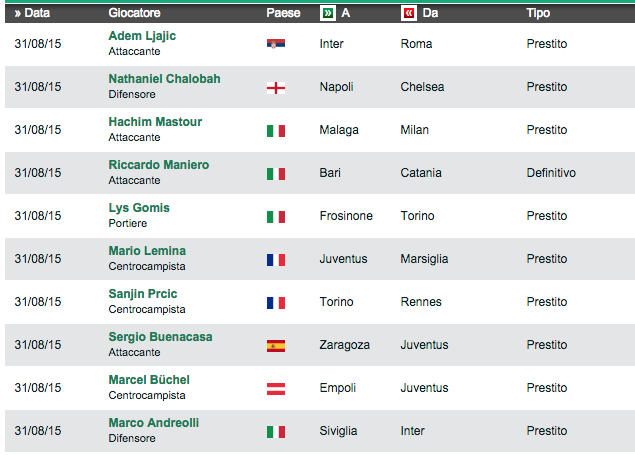 FOTO – Tutte le trattative concluse nelle ultime ore di mercato 31 Ago 2015 - 23:41 di Antonio Manzo Tutte le trattative di calciomercato chiuse in queste ultime ore. Fonte: goal.com Antonio Manzo CEO e Founder del Nuovevoci Network che comprende SpazioNapoli, SpazioMilan, SpazioJ, SpazioInter e Rompipallone.it. Giornalista e direttore di SpazioNapoli.it. Amo la comunicazione, la creatività e la leggerezza.