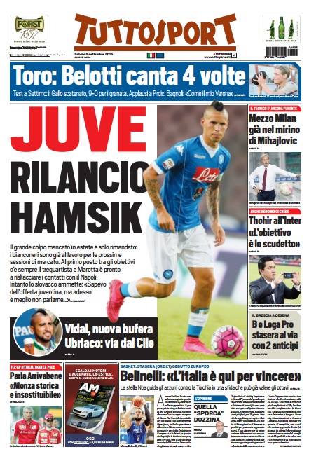 Capitolo chiuso, con testa e propositi completamente diretti alla nuova stagione. A Torino, ed in particolare per il più autorevole quotidiano sportivo della città della Mole, Tuttosport, il parere è ben diverso: la prima pagina dell’edizione odierna è dedicata a Marek Hamsik. Sullo sfondo un possibile, nuovo, approccio tra i due club nel mercato di gennaio per portare allo Juventus Stadium il numero 17 partenopeo.