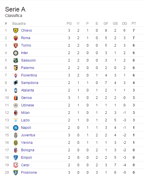 Ecco la classifica di Serie A dopo gli anticipi del sabato: