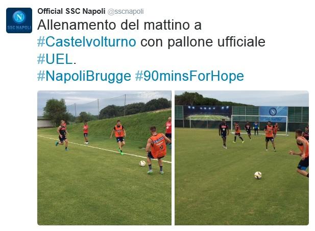 Allenamento mattutino per il Napoli a Castel Volturno, con la squadra di Sarri in campo in vista della gara di giovedì valida per l’esordio in Europa League contro il Brugge. Come riporta il profilo ufficiale Twitter dei partenopei, si va in campo con il pallone ufficiale dell’Europa League.