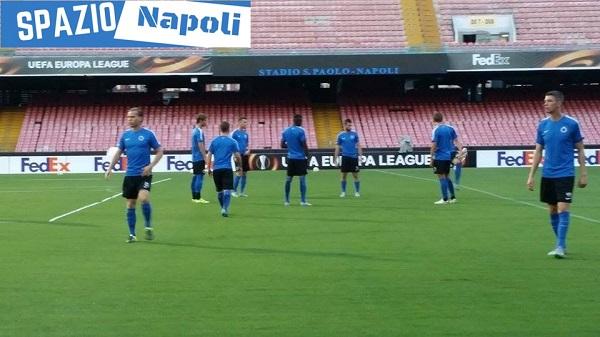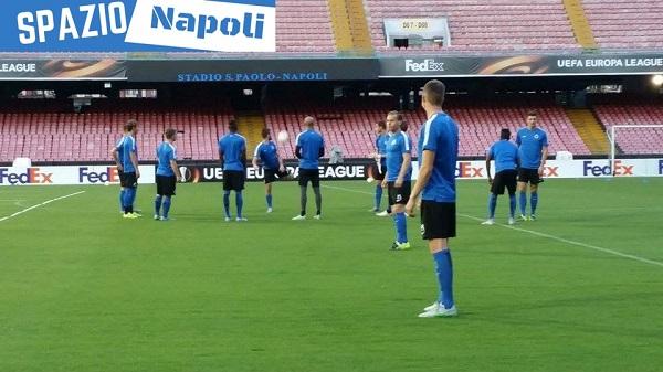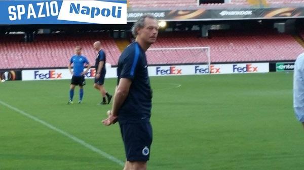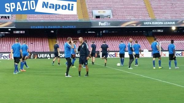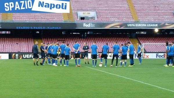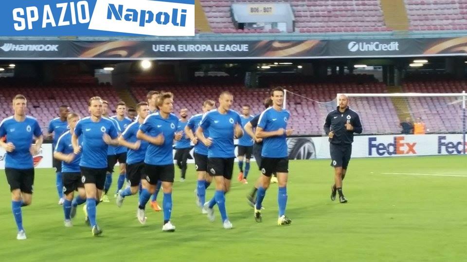 Dopo la conferenza stampa della vigilia, nella quale hanno parlato il tecnico Michel Preud’homme e il difensore belga Laurens De Bock, il Club Brugge ha testato il prato del San Paolo con una seduta d’allenamento.