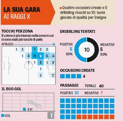 Insigne nel 4-3-3 – Sistema diverso, interpretazione diversa. In questo modulo Lorenzo Insigne parte sempre da sinistra per poi accentrarsi e andare o alla conclusione o a servire i compagni. E ieri sera con la Lazio queste due soluzioni sono state il tema principale della sua personalissima prestazione. Continui ‘uno contro uno’ per cercare di mettere gli esterni della Lazio in difficoltà, riuscendoci quasi sempre. Verticalizzazioni su verticalizzazioni nel cercare i piedi di Higuain e i tagli del suo dirimpettaio Callejon, ma anche per favorire gli inserimenti di Hamsik e Allan. Ed è proprio dai piedi di Insigne che è partito l’assist giusto con un’imbucata perfetta per il raddoppio del centrocampista brasiliano. Ma anche da un punto di vista difensivo il contributo del folletto napoletano è di vitale importanza. Si sacrifica, corre, inventa, crea, finalizza. Praticamente perfetto, proprio come evidenzia il grafico della Gazzetta: