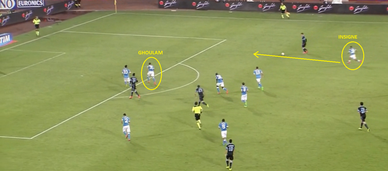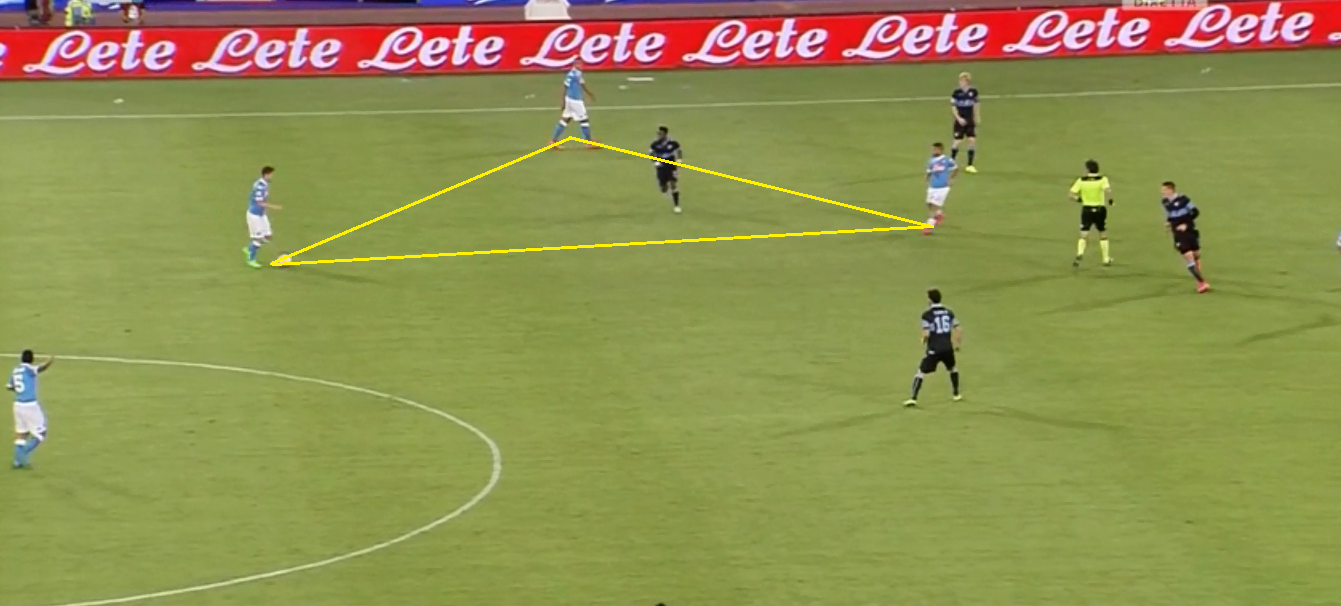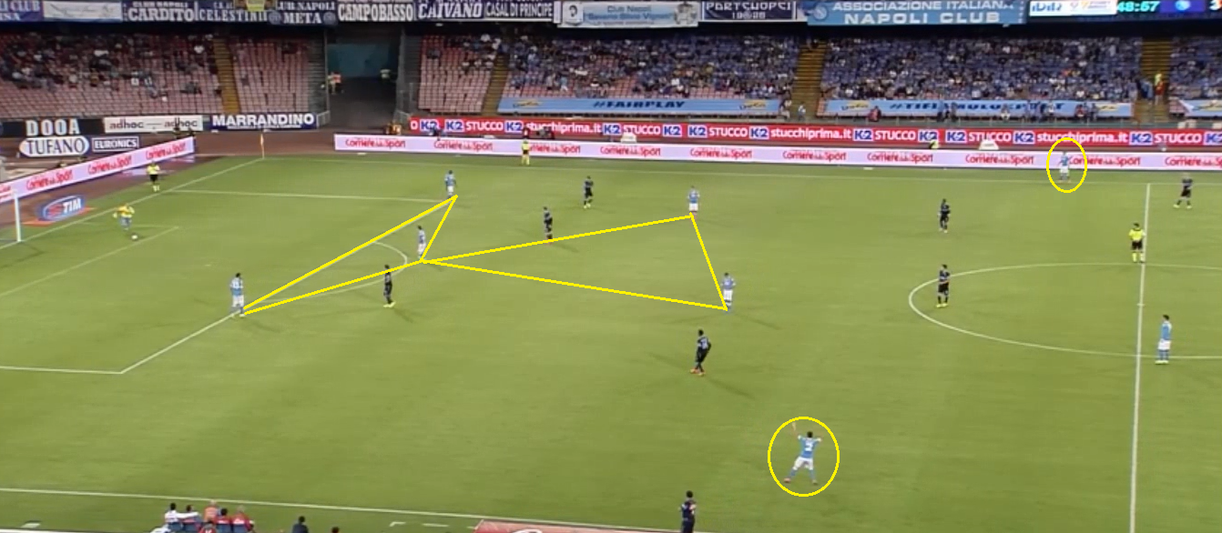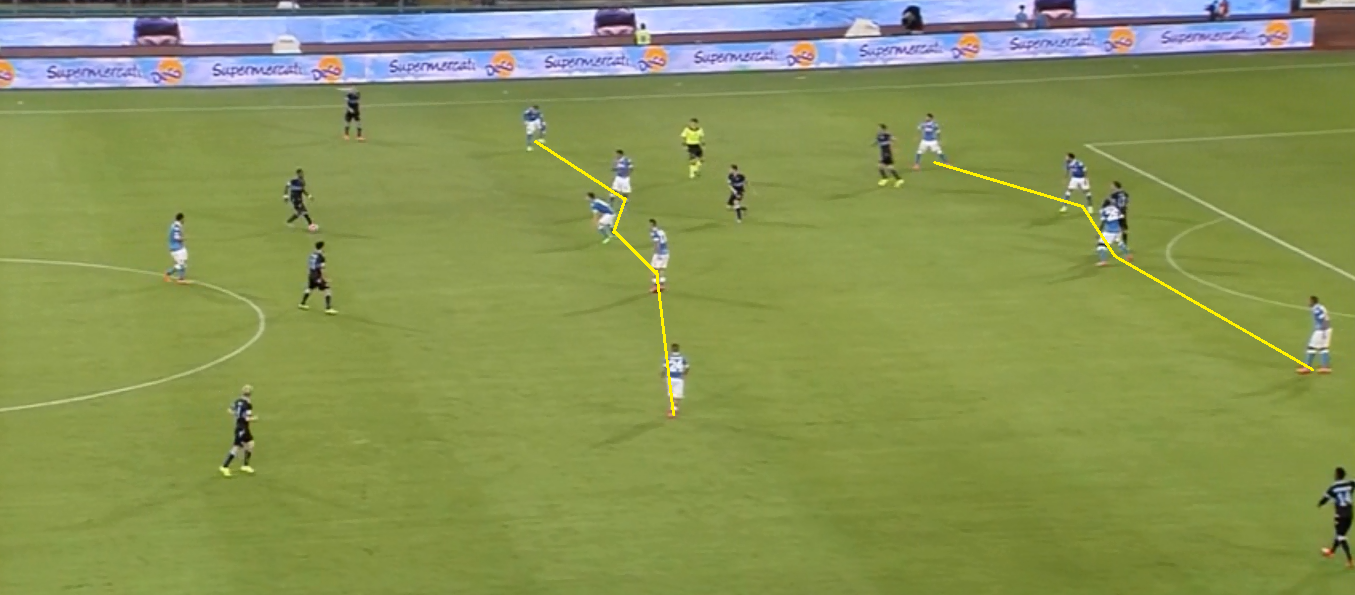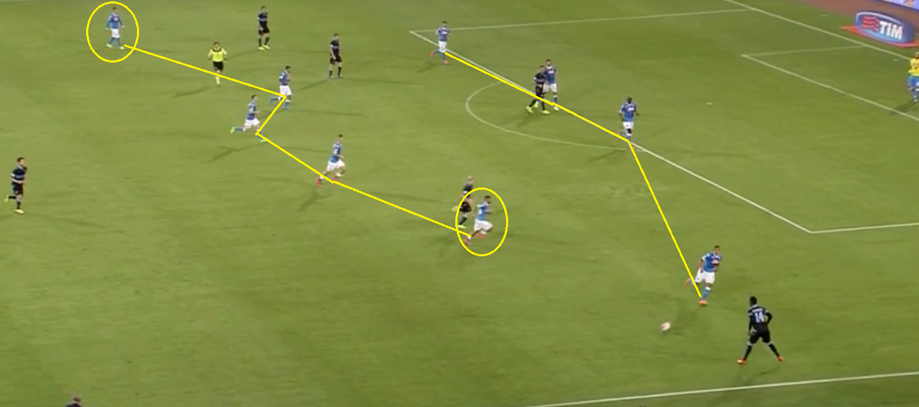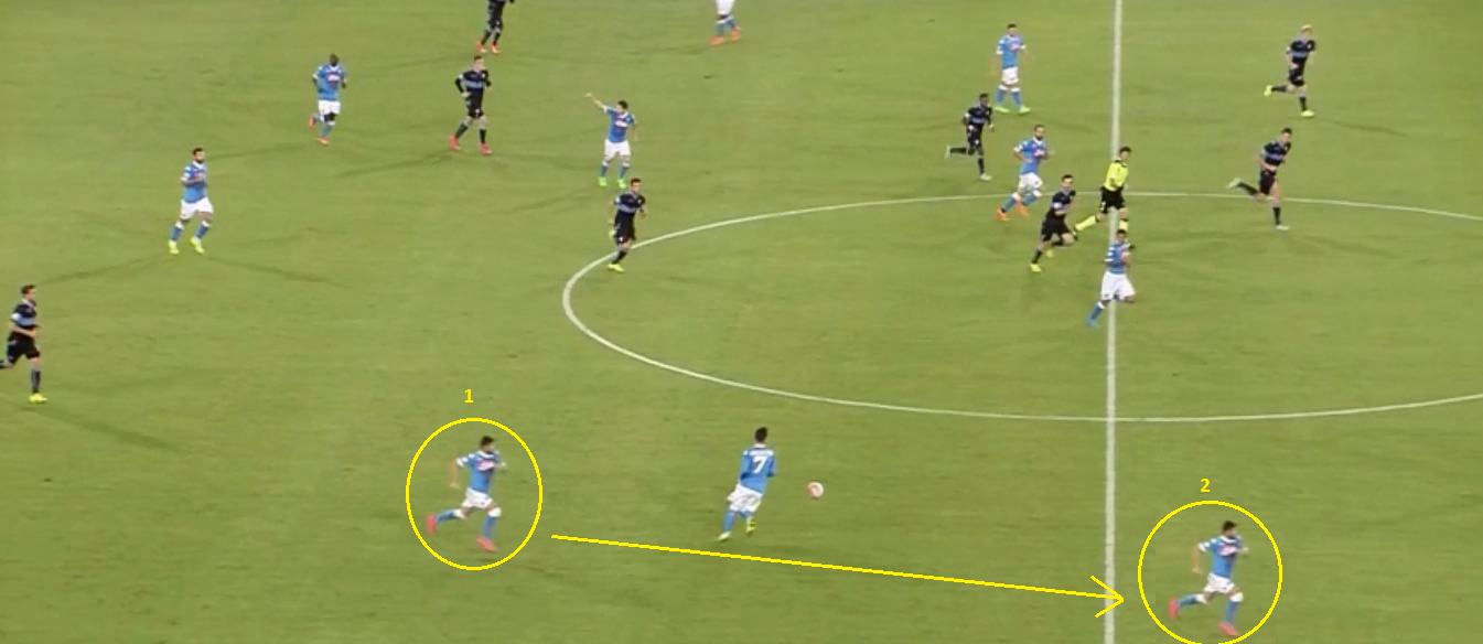 E, infine, come detto precedentemente, di grande importanza sono state le continue sovrapposizioni dei due terzini quando le due ali entravano in possesso palla. Soprattutto Hysaj ha garantito un gran numero di sovrapposizione. E infatti dalla corsia di destra i traversoni, sia bassi che alti, non sono di certo mancati. Nella prossima immagine si vede come, con Callejon in possesso palla, Hysaj si ‘preoccupi’ subito di andare in sovrapposizione in modo da creare la superiorità numerica in fascia: