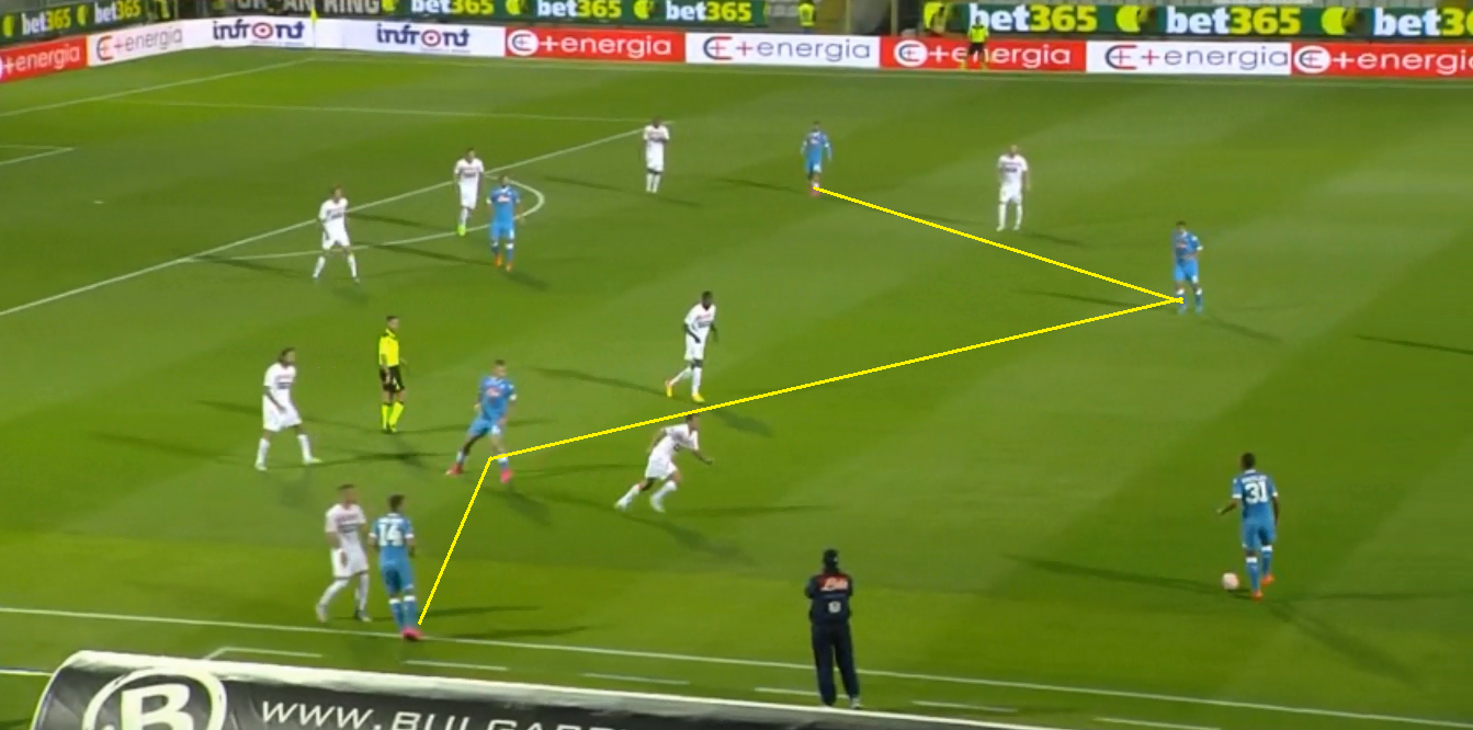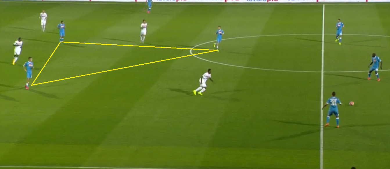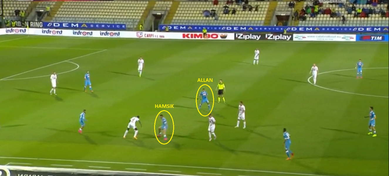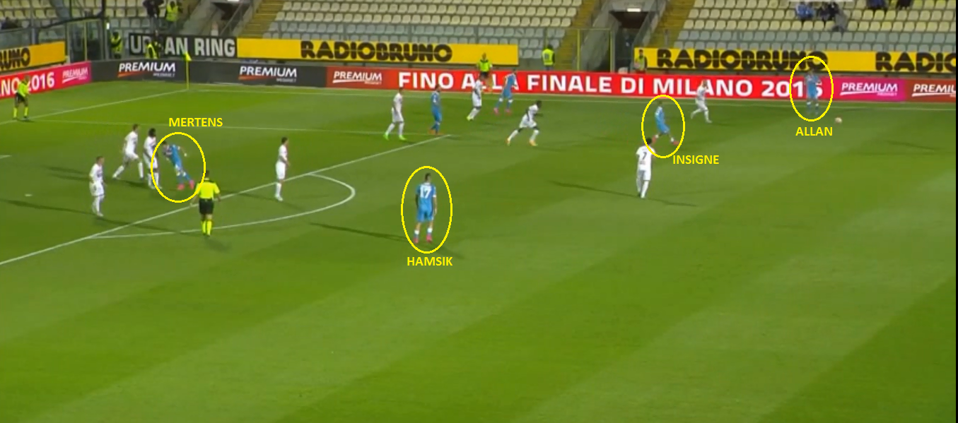 Oltre a ciò, un altro aspetto importante è stato il continuo sovrapporsi da parte delle mezzali alle spalle di Mertens e Insigne. Infatti, andando Hamsik e Allan continuamente in sovrapposizione davano modo alle due ali di accentrarsi in prossimità di Higuain, potendo in questo modo duettare con l’attaccante argentino. L’immagine mostra proprio la posizione di Allan e Hamsik, che danno l’ampiezza, e Mertens Insigne che si stringono: