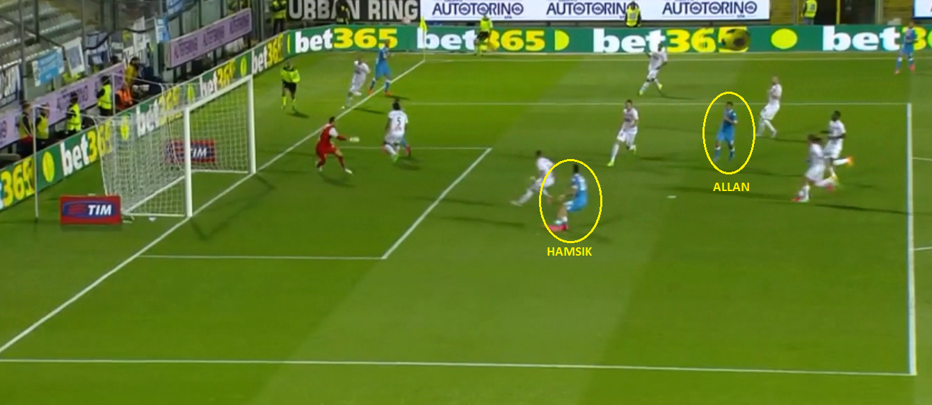 La posizione di Allan e Hamsik ha poi favorito gli inserimenti degli stessi in area di rigore dove potevano tornare utili con la loro scelta di tempo nello stacco di testa (cosa che non potevano di certo garantire Insigne e Mertens) sui cross di terzini e ali. E in varie occasioni i due si sono trovati in area di rigore, come quando Hamsik ha colpito su cross di Higuain in una delle rare occasioni da goal: