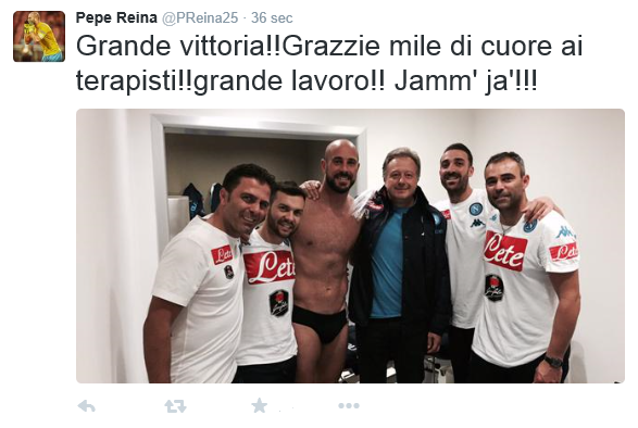 Grande carica di Pepe Reina al termine della gara stravinta a San Siro contro il Milan. Ecco il tweet con foto del portiere del Napoli che ringrazia i terapisti e lo staff medico azzurro che hanno permesso il suo recupero lampo.