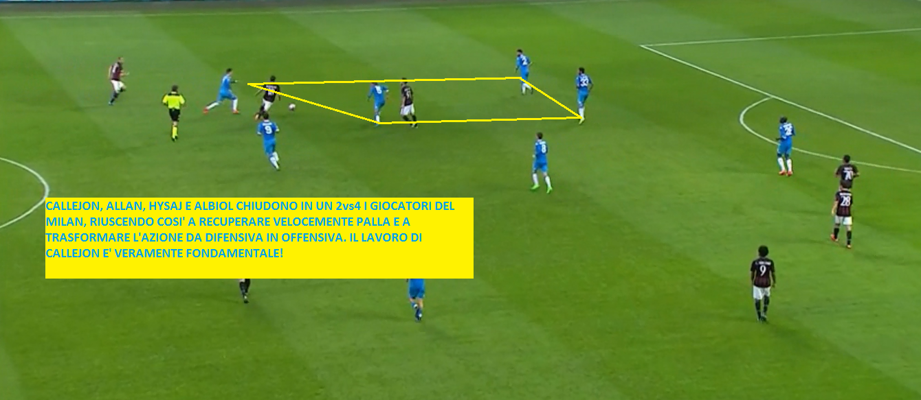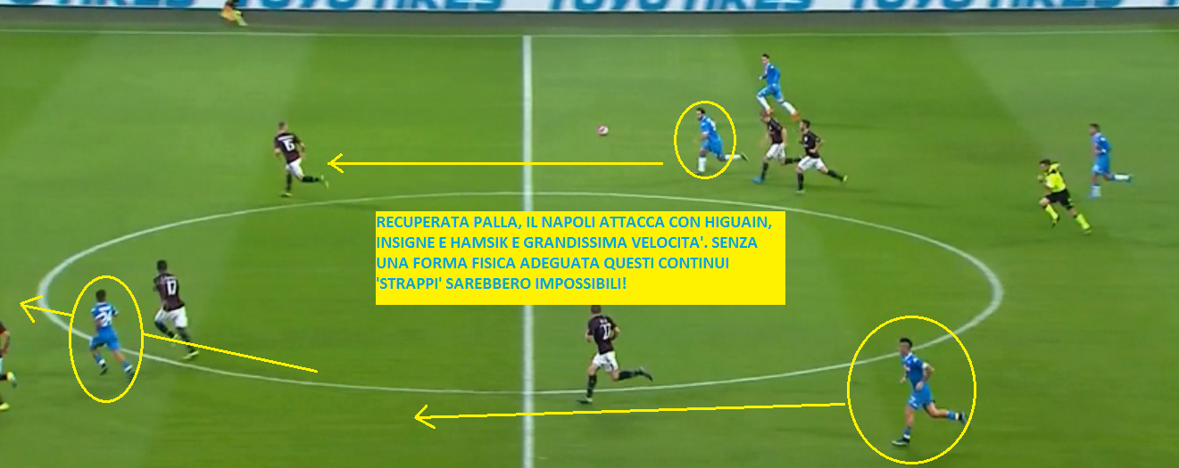 Così come si era visto in Polonia e, prima ancora, in casa contro la Juventus, anche contro il Milan il Napoli aggredisce gli avversari, che si sbilanciano in avanti in cerca del pareggio, e trasforma in pochissimi attimi l’azione da difensiva in offensiva. Pressing, recupero e via a massima velocità ad attaccare lo spazio senza palla: