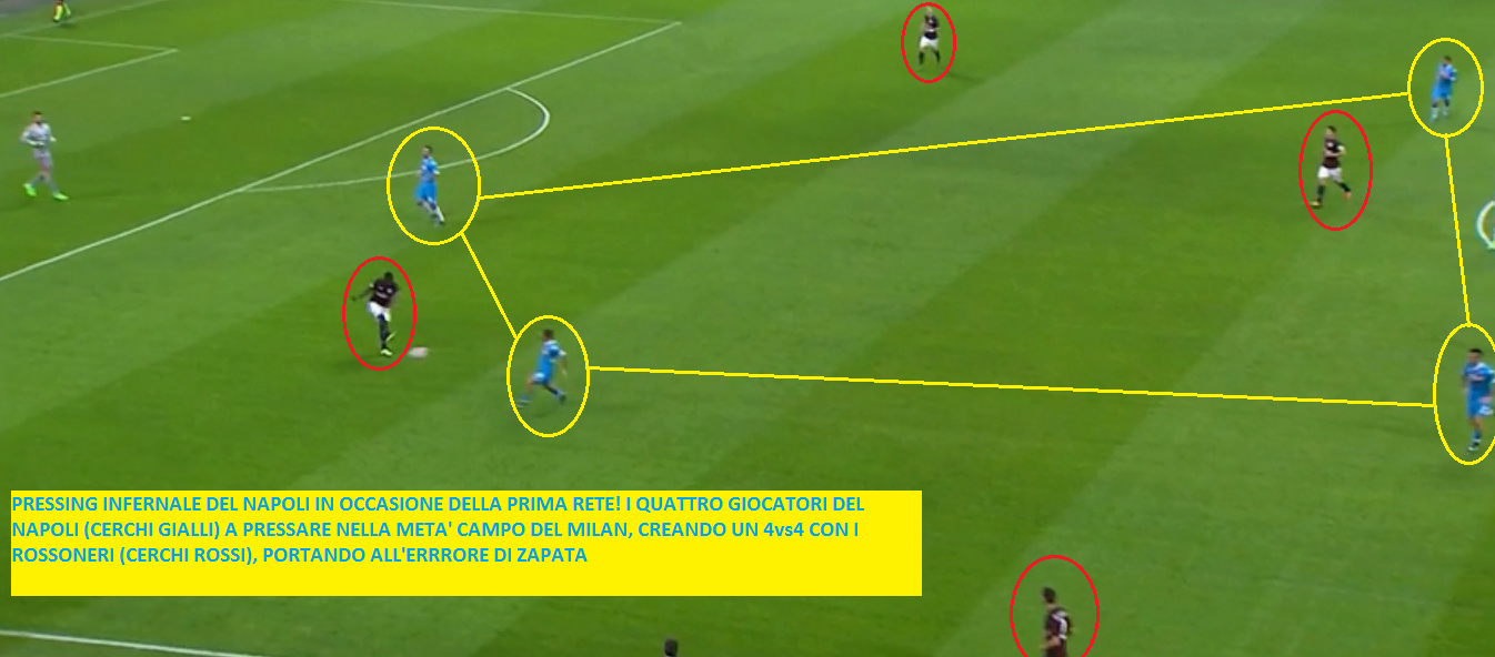 PRESSING A TUTTO CAMPO – È questo il primo aspetto fondamentale messo in mostra dal Napoli che ha consentito agli azzurri di ribaltare più e più volte l’azione e trovando così i quattro goal che annientano il Milan. Già subito in occasione del vantaggio degli azzurri c’è un’aggressività immediata dei calciatori del Napoli che porta all’errore della difesa del Milan: