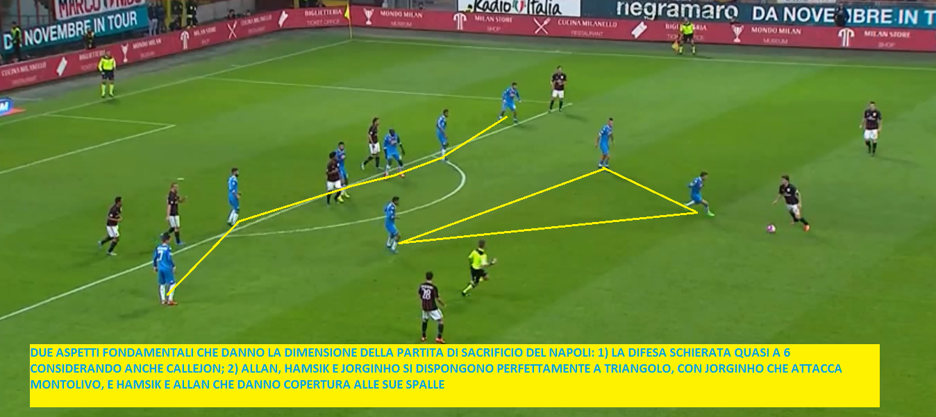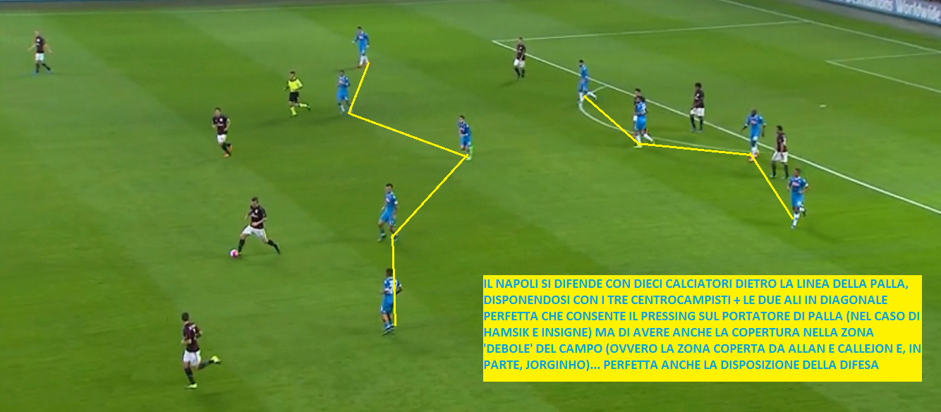 COMPATTEZZA DEI REPARTI – Ovviamente il Napoli non ha potuto per tutta la partita aggredire gli avversari per poi ripartire. E quindi anche l’aver avuto una compattezza continua dei tre reparti è stato di vitale importanza nell’economia della partita. Quando serviva, i calciatori del Napoli si disponevano addirittura in undici dietro la linea del pallone per non lasciare neanche un solo centimetro alla manovra del Milan. E questa precisa scelta tattica si è ripetuta più volte durante la partita: