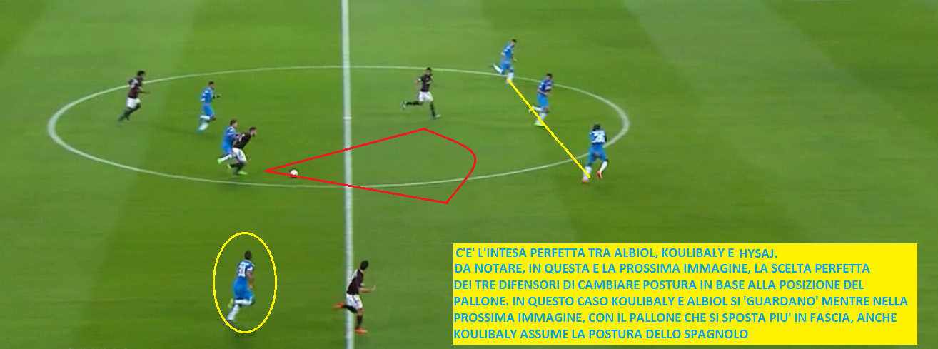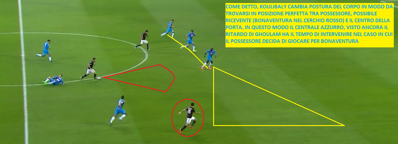 I MOVIMENTI PERFETTI DELLA DIFESA – Ultimo aspetto interessante da analizzare è l’intesa riscontrata nel reparto difensivo. Anche semplicemente la scelta della postura da parte dei calciatori è sintomo di un’assimilazione dei concetti da parte dei quattro difensori che ormai sembra cosa certa. Nella prossima immagine si nota come Koulibaly cambi la postura del corpo in base alla posizione del pallone guidato da Bertolacci. Quando Bonaventura riesce a prendere il tempo a Ghoulam e quindi si crea la possibilità di un passaggio da parte di Bertolacci, il centrale francese cambia la posizione del corpo in modo da poter avere una visuale perfetta del giocatore in possesso e del possibile ricevente: