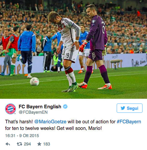 La Germania ha perso ieri sera a Dublino contro l’Irlanda per 1-0, ma il problema più grande sembra un altro al momento: verso la fine del primo tempo si è infatti fatto male seriamente Mario Götze. Il comunicato del Bayern Monaco spiega che il trequartista dovrà restare fermo da un minimo di 10 a un massimo di 12 settimane. Il che, considerando la pausa invernale della Bundesliga, significa rivederlo in campo direttamente nel 2016.