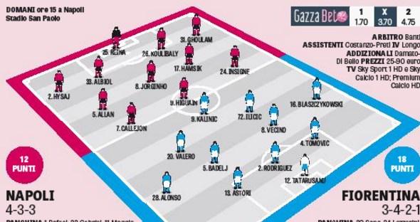 Nessuna sorpresa nell’undici di Maurizio Sarri: davanti a Pepe Reina, la linea a quattro sarà composta da Hysaj, Albiol, Koulibaly e Ghoulam; a centrocampo il trio finora meglio assortito con Jorginho, Hamsik e Allan. Il tridente offensivo sarà invece composto da Callejon, Insigne e Gonzalo Higuain. Paulo Sousa dovrebbe invece affidarsi ad un 3-4-2-1 con Tatarusanu tra i pali. Tomovic, Rodriguez e Astori per la linea difensiva, centrocampo con fase Kuba e Alonso sulle fasce e Vecino e Badelj centrali. Ilicic e Borja Valero saranno invece alle spalle di Kalinic, prima punta viola.