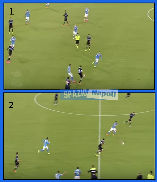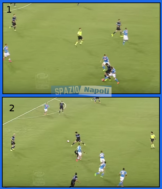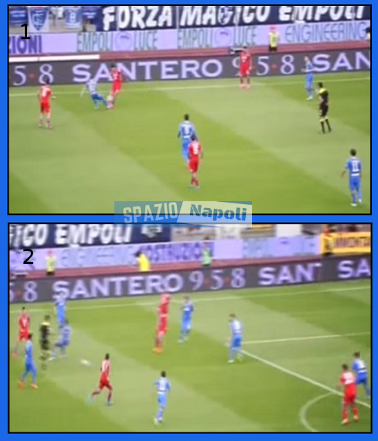 Scena che si è ripetuta alla terza giornata (Empoli-Napoli finita 2-2) in occasione della seconda rete degli azzurri. È ancora Marek Hamsik ad andare al recupero della sfera: lo slovacco vince un contrasto con un avversario sulla corsia mancina (foto 1), e subito ne approfitta per ribaltare l’azione servendo Gabbiadini (foto 2).