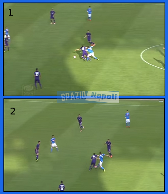 I viola hanno appena trovato il pareggio ma i partenopei non demordono e si tuffano all’attacco. E basta poco per premiare gli sforzi: Ilicic sbaglia un controllo nella sua trequarti campo e il Pipita Higuain, come un falco, si lancia sul pallone ingaggiando un corpo a corpo con lo sloveno da cui esce vincitore (foto 1). L’attaccante argentino riesce a prendere posizione di vantaggio e tocca la sfera in direzione di Mertens (foto 2), il belga chiude l’1-2 con il compagno e lo mette davanti al portiere. Higuain poi fa secco Tatarusanu con un morbido tocco con il sinistro.