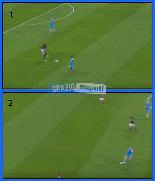 Al dare il là alla notte magica del Napoli è però sempre lo stesso meccanismo di pressione alta che permette il recupero del pallone nella metà campo avversaria. Stavolta è Zapata che, impaurito dall’arrivo di Insigne, sparacchia alla men peggio la sfera (foto 1). Hamsik è il più lesto a recuperarla e la serve subito verso Insigne (foto 2), il talento di Frattamaggiore poi sfrutterà un buco venutosi a creare nella retroguardia milanista per servire Allan che porterà in vantaggio il Napoli.