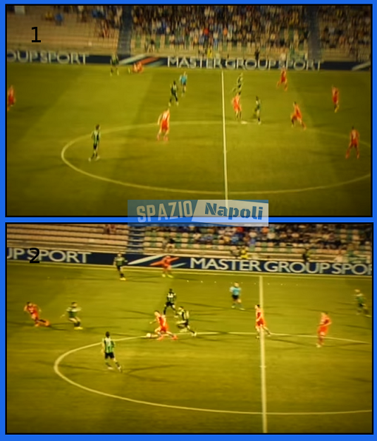 Come si può apprezzare da questo doppio fotogramma, Sarri ha iniziato fin da subito ad inculcare ai suoi la cultura del pressing alto. L’aggressione ai portatori di palla avversari, infatti, è un fattore imprescindibile per il tecnico di Figline, un dogma che esula dal modulo di gioco che poi si adotta in campo.