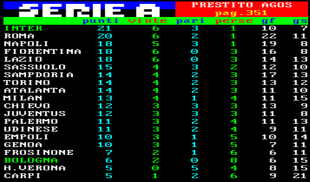 ECCO LA CLASSIFICA MOMENTANEA (Da Televideo):