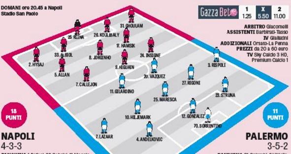 Pochi giorni per rifiatare e la Serie A tornerà a scendere in campo. Il Napoli, reduce dalla vittoria del Bentegodi, aspetta il Palermo tra e mura di casa. Pochi dubbi per Sarri, che continua a ribadire la scarsa propensione verso il turnover. La Gazzetta dello Sport prova ad anticipare le probabili formazioni del match. Maurizio Sarri dovrebbe riconfermare l’undici di Verona, con Reina in porta e la difesa titolarissima, composta da Hysaj, Albiol, Koulibaly e Ghoulam. A centrocampo Allan, Jorginho e Hamsik, con Callejon, Higuain e Insigne nel tridente d’attacco. Non sono esclusi ballottaggi, con Maggio che potrebbe prendere il posto di Ghoulam e Mertens uno tra quelli di Callejon e di Insigne.