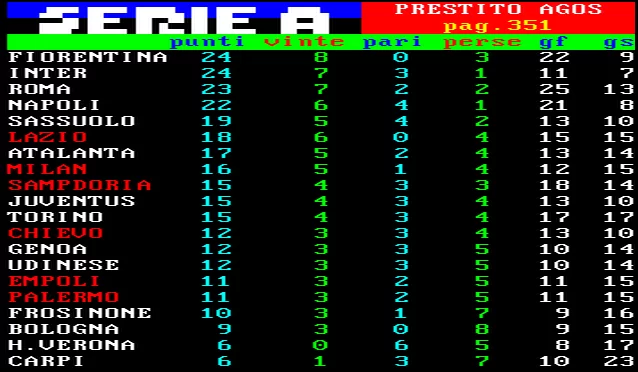Pomeriggio privo di particolari emozioni in Serie A. Malgrado l’apertura col botto della Fiorentina, che ha sconfitto alle 12.30 il Frosinone per 4-1, il resto del pomeriggio non è stato entusiasmante. Pareggi per 0-0 a Genova (Genoa-Napoli), Udine, dove era ospite il Sassuolo e a Reggio Emilia tra Carpi e Verona. L’unica vittoria firmata dal Bologna, che con il cambio di allenatore è tornata al successo: 3-0 sull’Atalanta. Il Napoli fallisce l’aggancio in vetta alla classifica e si ferma a quota 22 punti, a due lunghezze da Fiorentina e Inter e a una dalla Roma. Ecco la foto della classifica aggiornata: