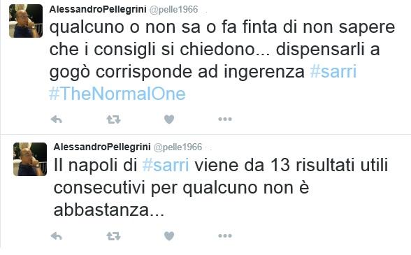 Eppure, sembra che la critica resti all’ordine del giorno e dietro l’angolo, nonostante il momento più che positivo del club di De Laurentiis. A difesa del suo assistito scende in campo Alessandro Pellegrini, l’agente di Maurizio Sarri, che su Twitter si sfoga contro chi dispensa consigli all’allenatore o ne critica quanto di fatto ad oggi all’ombra del Vesuvio. Due i messaggi più forti pubblicati nelle ultime ore. Il primo è lapalissiano: “Il Napoli di Sarri viene da 13 risultati utili consecutivi e per qualcuno non è abbastanza”.