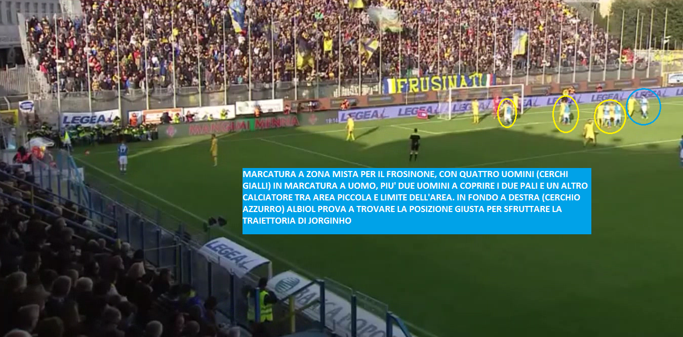 Gli azzurri attuano lo schema chiamato da Jorginho, spostando alcuni uomini verso il primo palo in modo da creare un vuoto sul secondo, con Albiol libero di fronteggiarsi in un contrasto col diretto avversario. Lo spagnolo ha la meglio e mette la sfera in fondo al sacco: