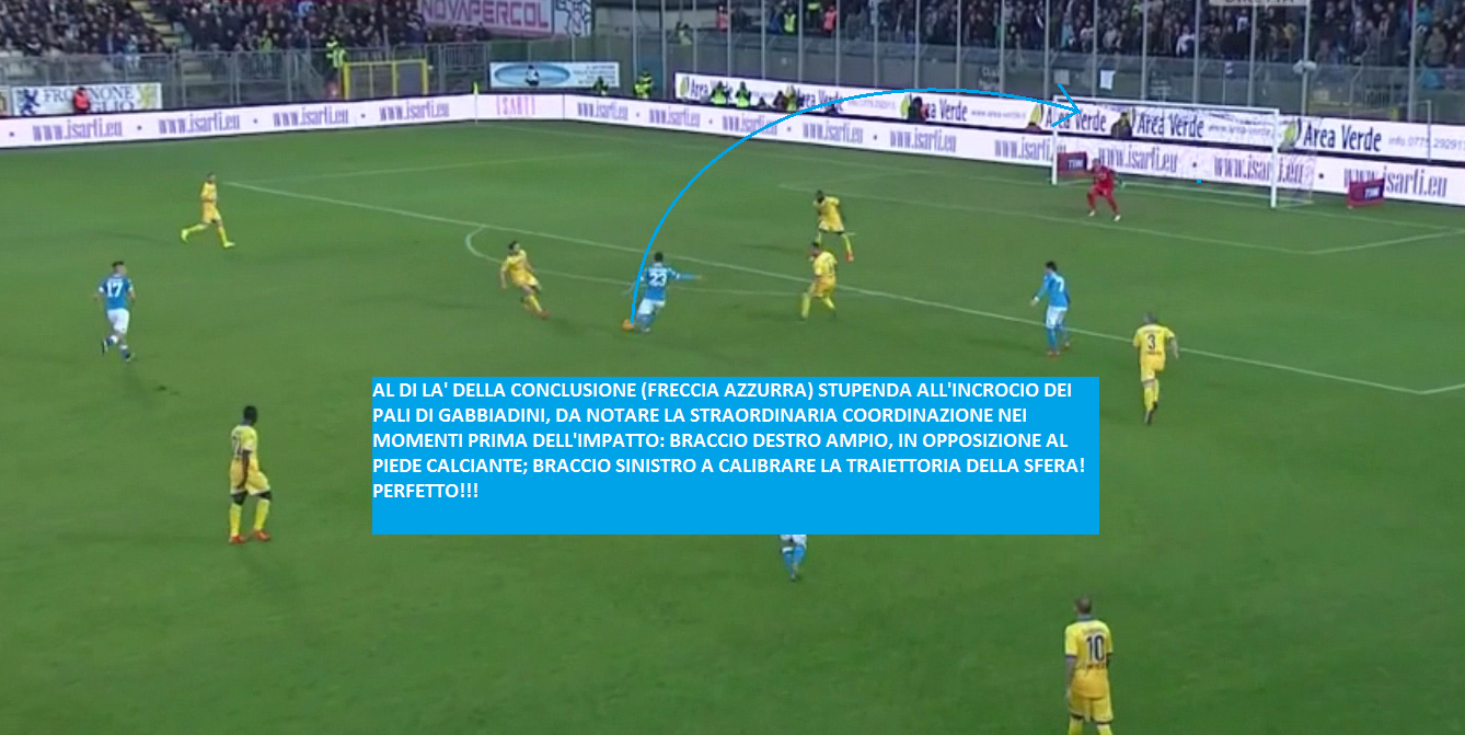 La palla giunge nei piedi di Gabbiadini, e quello che inventa il numero 23 azzurro è una perla. Tiro di sinistro all’incrocio dei pali. Ma quello che realmente sorprende è la coordinazione del calciatore: