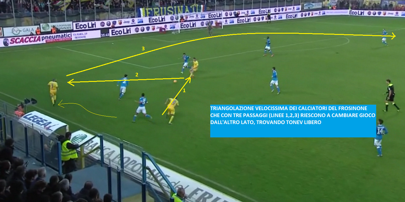 IL GOAL DELLA BANDIERA DEL FROSINONE – Il Napoli inizia i festeggiamenti e molla la presa. I padroni di casa ne approfittano al minuto 82′ con la rete di Sammarco dopo un’azione bellissima. Veloce triangolazione in fascia tra i tre ‘canarini’ e improvviso cambio di campo a cercare Tonev: