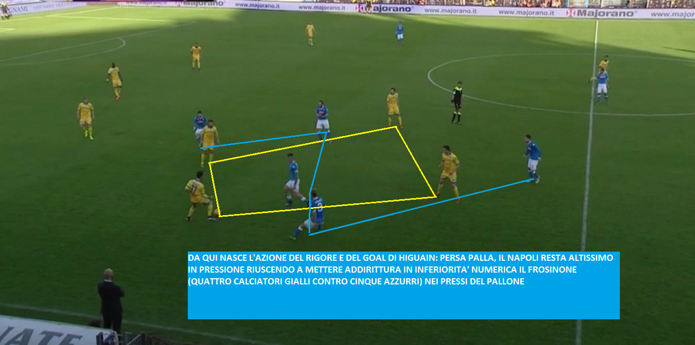 IL RADDOPPIO DEL NAPOLI – Nonostante il vantaggio, gli azzurri continuano a macinare gioco. Al 30′ arriva anche il raddoppio grazie a un calcio di rigore procurato e trasformato da Higuain. L’azione del rigore nasce da un ottimo pressing del Napoli subito dopo aver perso palla. Gli azzurri non indietreggiano, ma vanno in pressione immediata, mettendo in inferiorità i padroni di casa in possesso palla: