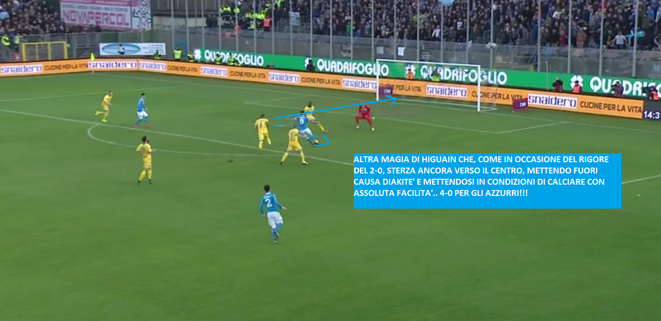 L’azione continua, e il ‘Pipita’ costruisce un altro capolavoro. Così come in occasione del calcio di rigore, anche in questo caso l’attaccante argentino, arrivato in area in possesso palla, sterza verso il centro liberandosi del diretto avversario. Senza ormai nessuna opposizione, Higuain mette dentro il goal del 4-0: