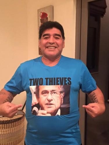 Stefano Ceci, amico e manager di Diego Armando Maradona, ha pubblicato una foto sul suo profilo Facebook che ritrae il Pibe de Oro con una maglia molto particolare: “Two Thieves”, ovvero due ladri, con un’immagine composta dalle facce di Blatter e Platini.