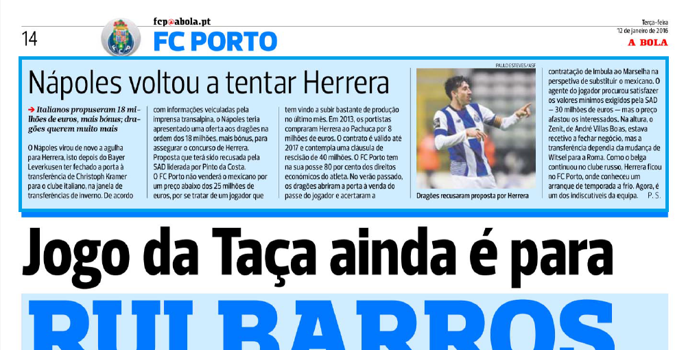Come si legge sulle pagine del quotidiano portoghese A Bola, il Napoli starebbe continuando a sondare il terreno per Héctor Herrera, centrocampista messicano del Porto. I partenopei sarebbero tornati all’attacco del messicano dopo che il Bayer Leverkusen sembra aver chiuso la porta alla cessione di Christoph Kramer. Il Napoli dunque avrebbe presentato un’offerta da 18 milioni di euro, più bonus, per assicurarsi le prestazioni di Héctor Herrera. La proposta però – continua A Bola – sembra essere stata respinta dal presidente del Porto, Pinto da Costa. I portoghesi infatti non sembrano intenzionati a lasciar partire il calciatore per meno di 25 milioni, soprattutto in virtù delle prestazioni del calciatore nell’ultimo mese.