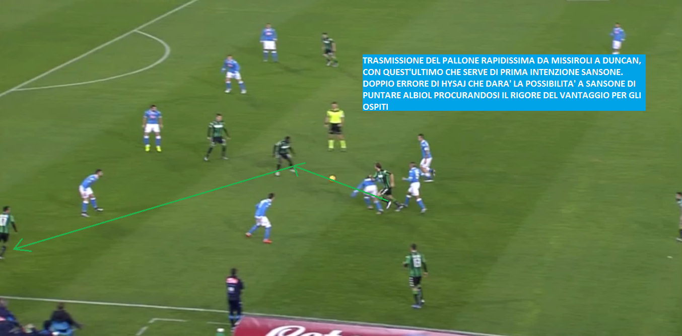 VANTAGGIO DEL SASSUOLO – Pronti, via, e il Sassuolo trova il calcio di rigore del vantaggio dopo 2′. L’azione nasce da un’interpretazione difensiva degli ospiti praticamente uguale a quella del Napoli: persa palla, gli uomini di Di Francesco non arretrano, ma restano alti per portare l’immediato pressing sugli avversari: