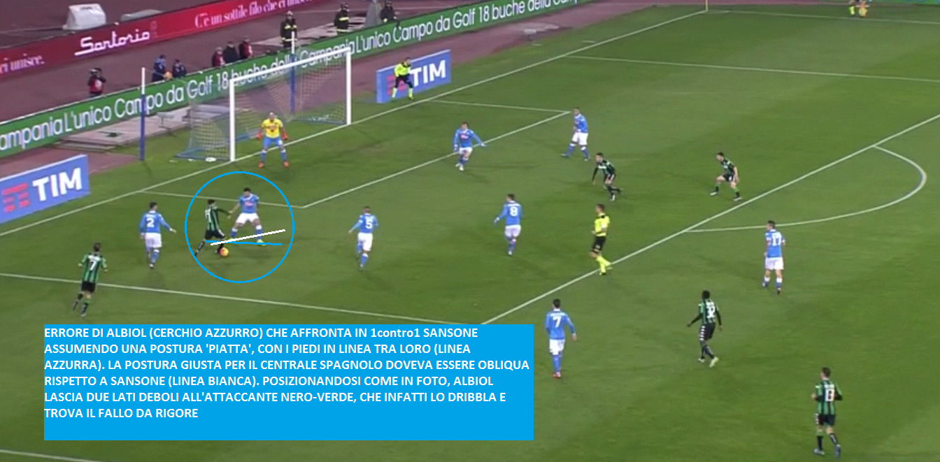 Dopo una serie di errori di Hysaj, la sfera giunge nei piedi di Sansone, il quale punta immediatamente Albiol sfidandolo in 1contro1. Ed è qui che nasce l’errore del centrale spagnolo: Albiol affronta l’ala del Sassuolo assumendo una postura totalmente sbagliata. Lo spagnolo infatti va in chiusura con entrambi i piedi ‘piatti’, lasciando così a Sansone due lati deboli da poter puntare: