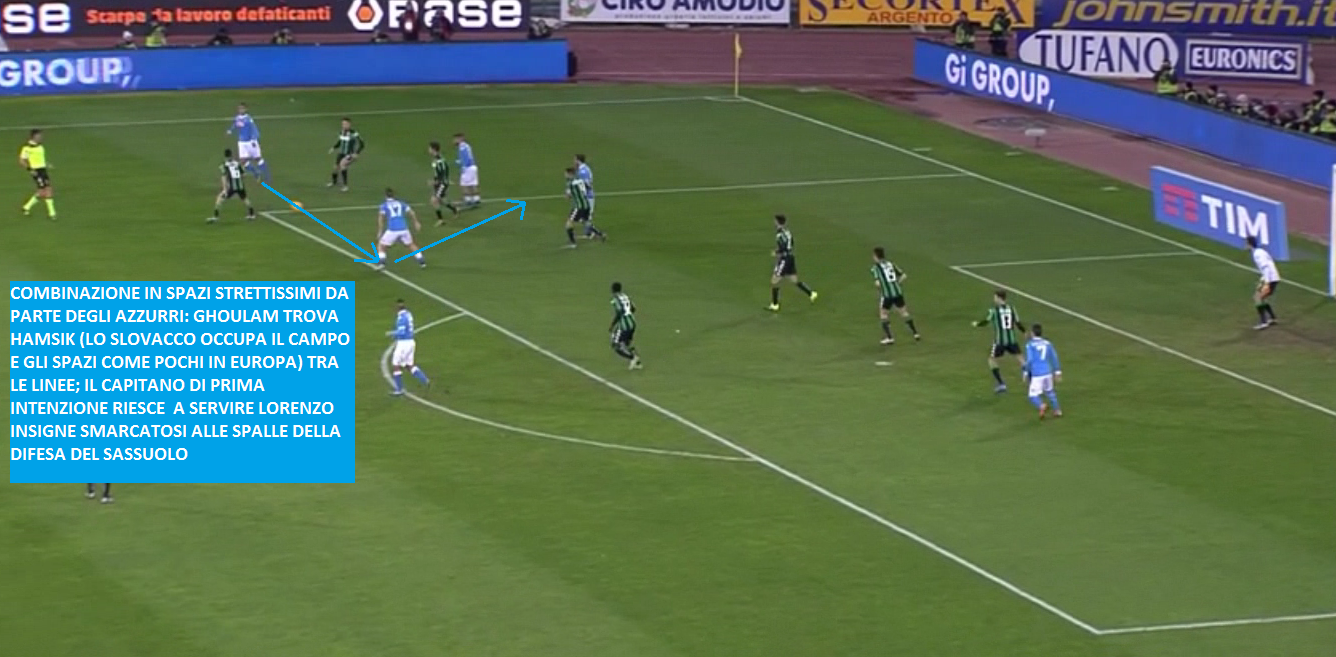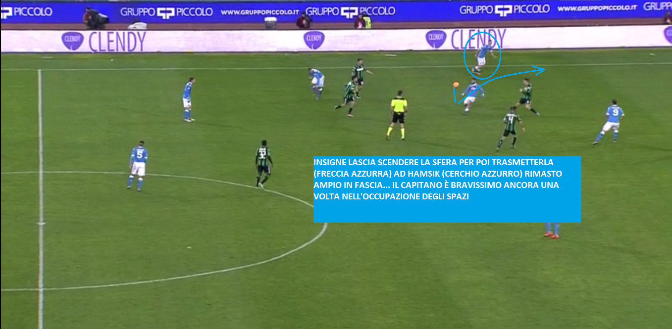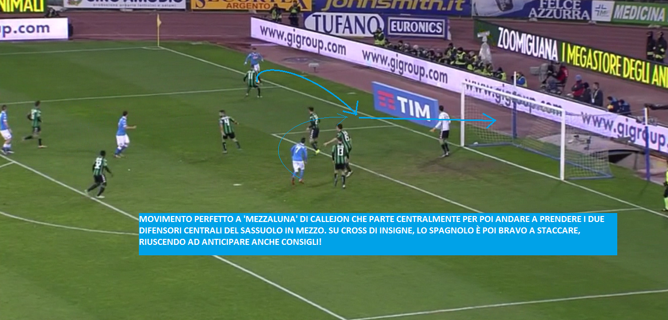 E poi è tutto da ammirare il lavoro senza palla di Callejon: lo spagnolo parte centralmente e appena Insigne alza la testa (unico momento in cui il numero 24 azzurro vede il compagno) Callejon effettua un movimento a ‘mezzaluna’ prendendo così il tempo ai difensori nero-verdi: