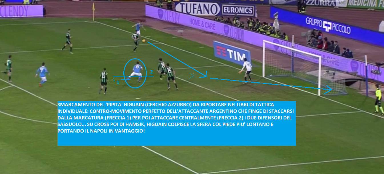 Recuperata palla, Callejon serve Higuain in area di rigore. L’attaccante argentino ha tutto il tempo, vista la stanchezza dei difensori del Sassuolo, di spostarsi il pallone sul sinistro e di lasciar partire un tiro violentissimo. Palla in rete e partita chiusa:
