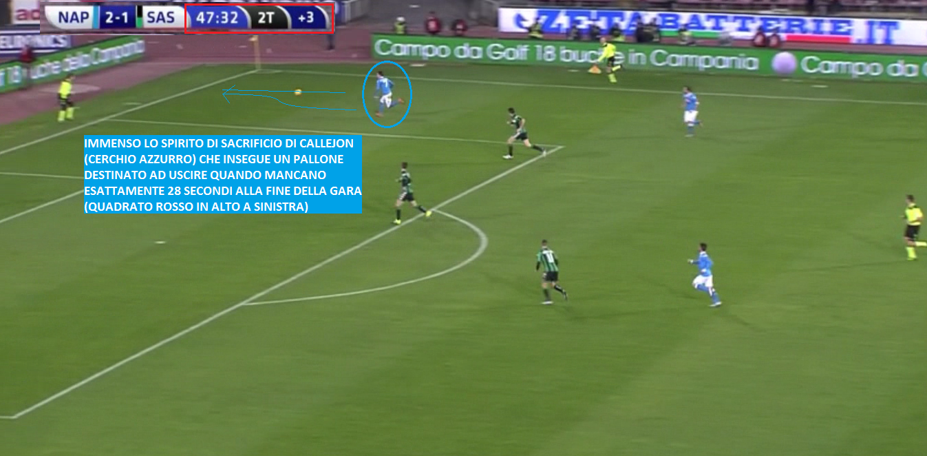 SFIDA CHIUSA ALL’ULTIMO SECONDO – Per tutto il secondo tempo la sfida resta in bilico, con il Napoli che tenta di chiuderla e con il Sassuolo che cerca di rimetterla in piedi. Alla fine, gli azzurri riescono a mettere il punto esclamativo sulla gara solo al 93′, ancora con Higuain. Ma il merito è quasi tutto di Callejon. Lo spagnolo infatti a pochissimi secondi dalla fine della gara riesce ancora a trovare la forza per inseguire un pallone quasi perso: