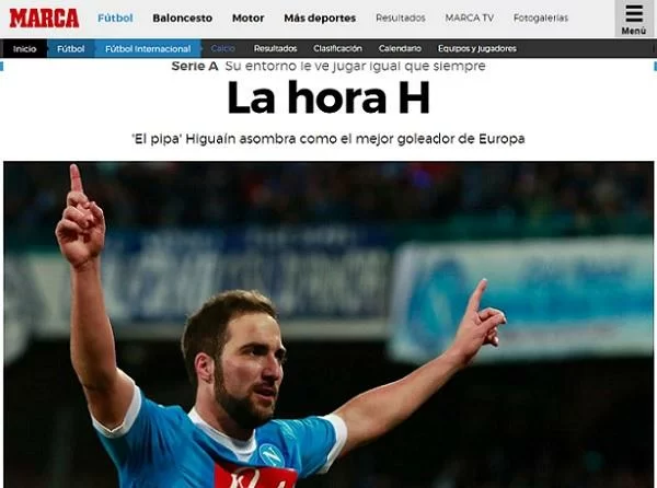 Il quotidiano madrileno, attraverso la propria versione online, esalta la grande stagione di Gonzalo Higuain e di tutto il Napoli, sottolineando la crescita dell’argentino sotto la guida di Maurizio Sarri, dopo due stagioni al di sotto delle sue capacità, riconoscendo al popolo partenopeo di averlo sempre amato e sostenuto.