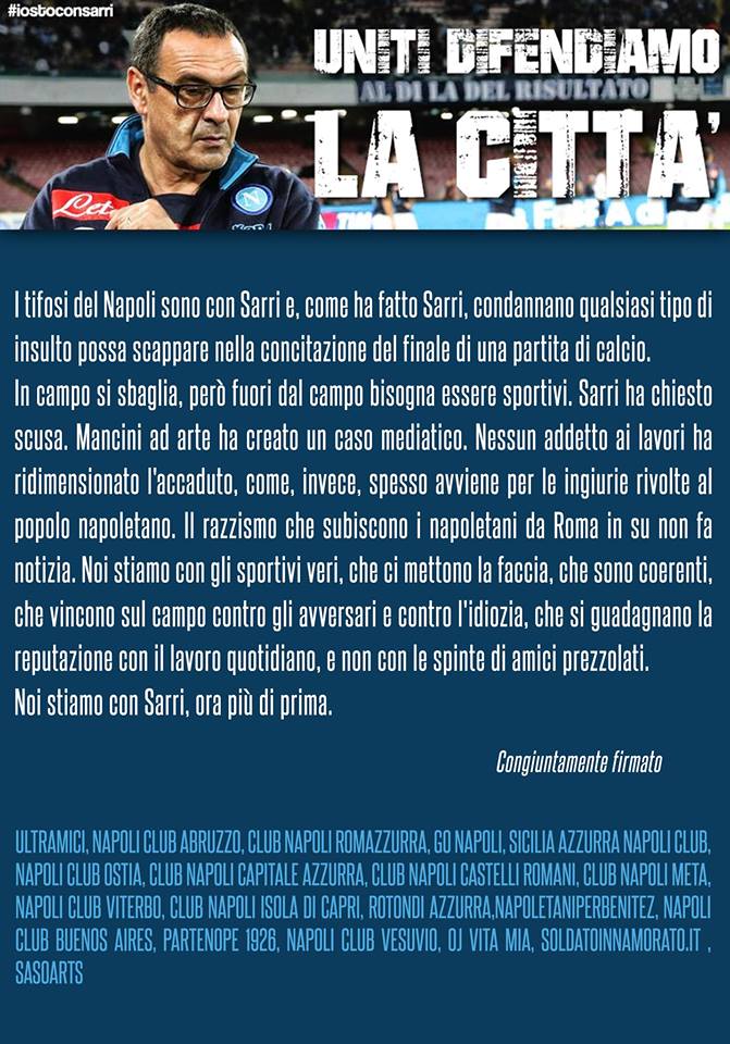 Una parte della tifoseria azzurra, attraverso un comunicato congiunto di tanti Club Napoli, ha voluto far sentire la propria voce, difendendo Maurizio Sarri dalle accuse di queste ore. Queste le parole degli ultrà: “I tifosi del Napoli sono con Sarri e, come ha fatto Sarri, condannano qualsiasi tipo di insulto possa scappare nella concitazione del finale di una partita di calcio. In campo si sbaglia, però fuori dal campo bisogna essere sportivi. Sarri ha chiesto scusa. Mancini ad arte ha creato un caso mediatico. Nessun addetto ai lavori ha ridimensionato l’accaduto, come, invece, spesso avviene per le ingiurie rivolte al popolo napoletano. Il razzismo che subiscono i napoletani da Roma in su non fa notizia. Noi stiamo con gli sportivi veri, che ci mettono la faccia, che sono coerenti, che vincono sul campo contro gli avversari e contro l’idiozia, che si guadagnano la reputazione con il lavoro quotidiano, e non con le spinte di amici prezzolati. Noi stiamo con Sarri, ora più di prima”.