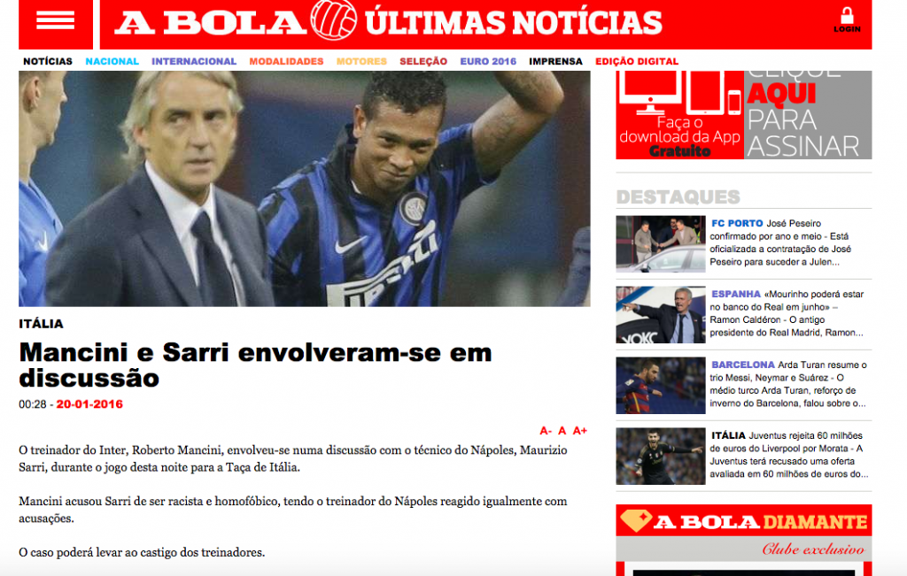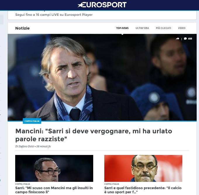 La polemica innalzata da Roberto Mancini in seguito ad alcuni “epiteti” rivolti verso di lui da Maurizio Sarri, nel corso del quarto di finale di Coppa Italia tra Napoli e Inter, ha avuto molto clamore in Italia ma anche al di là dei nostri confini. Ecco come i siti di Gazzetta dello Sport, Corriere dello Sport, Tuttosport, Eurosport, As, A Bola, The Guardian, Sport hanno titolato sulla questione.