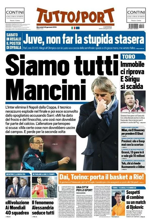Dei toni troppo accesi, un titolo esageratamente duro. Nella vita si può sbagliare e si può chiedere anche scusa per un errore, così come accaduto poco fa in diretta a Radio Crc. Ai microfoni il direttore di Tuttosport Paolo De Paola, che si redime per la prima del suo quotidiano all’indomani della sfida di Coppa Italia tra Napoli ed Inter ed in seguito alla querelle tra Sarri e Mancini. “Siamo tutti Mancini” ha titolato ieri (GUARDA QUI) per un dietro front quasi obbligato dopo le ultime indiscrezioni su un passato dello stesso Mancini non troppo pulito (LEGGI QUI). Ecco quanto raccolto da SpazioNapoli.