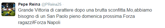 TWITTER – Reina: “Vittoria di carattere, domenica voglio il San Paolo pieno!”