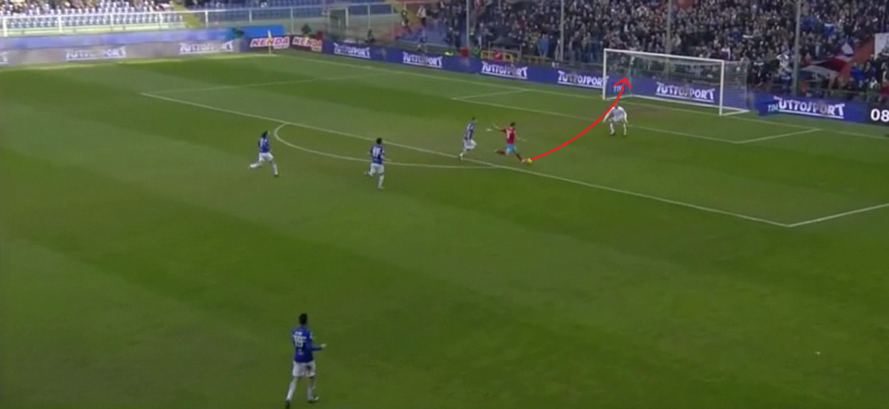 Ricevuta palla, il capitano dribbla due avversari e tocca la sfera con la punta nell’angolo alla sinistra di Viviano. Un capolavoro: